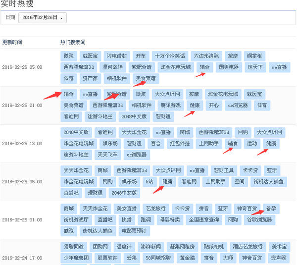 行為詞:行為詞的轉(zhuǎn)換率極高,開發(fā)者在選擇行為詞時,可以利用ASO114的實時熱搜,實時熱搜榜單變化是因用戶某一時間內(nèi)的搜索頻次而變化的,代表在某個時間段內(nèi)用戶在大量搜索榜單上的關鍵詞。個人喜歡挑選出現(xiàn)在榜單上的行為詞。如圖中標示出來一些出現(xiàn)頻次較記的行為詞。如果我的APP是一款菜譜類APP,那么,我便會把健康、輔食、減肥、美容等做為關鍵詞。