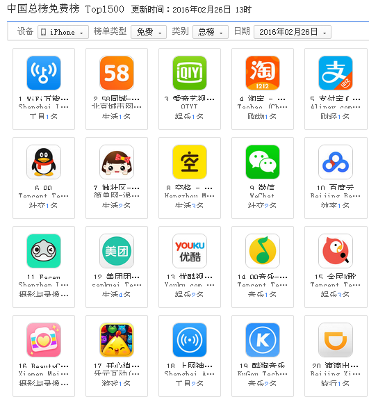 品牌詞:有的開發(fā)者說品牌詞最簡單了,不就一個名字嗎。其實不是這樣的,如果不是有強大的自信,品牌詞我還是建議抱抱大腿,如一款全民開店的APP,如果要抱微信的大腿,它的名字就可以叫微小店、微店等,而副標題則可以直接用微信開店真方便,或手機開店真方便。當然,不同性質(zhì)人的APP選擇的大腿對像當然也不一樣,這時候我們打開ASO114,查看中國區(qū)總榜免費榜Top1500名的APP,總有一款大腿適合你。